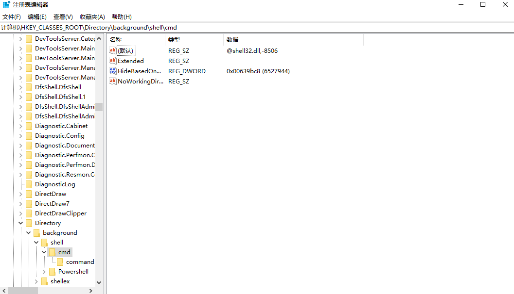 2.转到计算机\HKEY_CLASSES_ROOT\Directory\background\shell\cmd